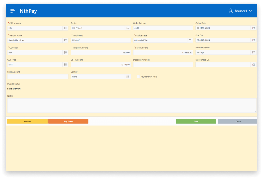 Yes. When it is entered it will be in draft mode. Once the user reviews the invoice, he can choose to confirm. A confirmed invoice can go for verification or directly go for payments as needed.